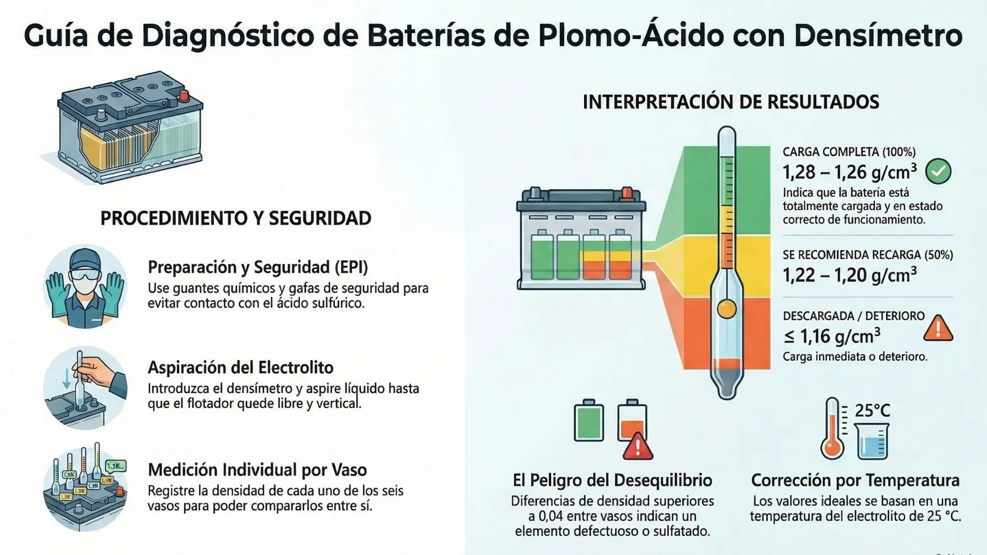 Guía de diagnóstico de batería de plomo-ácido con densímetro. El procedimiento consiste en medir la densidad del electrolito en cada vaso de la batería para determinar el estado de carga de la batería del automóvil y detectar posibles desequilibrios entre celdas.En baterías automotrices, valores cercanos a 1,28 g/cm³ indican carga completa, mientras que densidades inferiores pueden indicar batería descargada o deteriorada.Este método de comprobación es habitual en el mantenimiento de baterías de coche, acumuladores de plomo-ácido y sistemas eléctricos del automóvil.