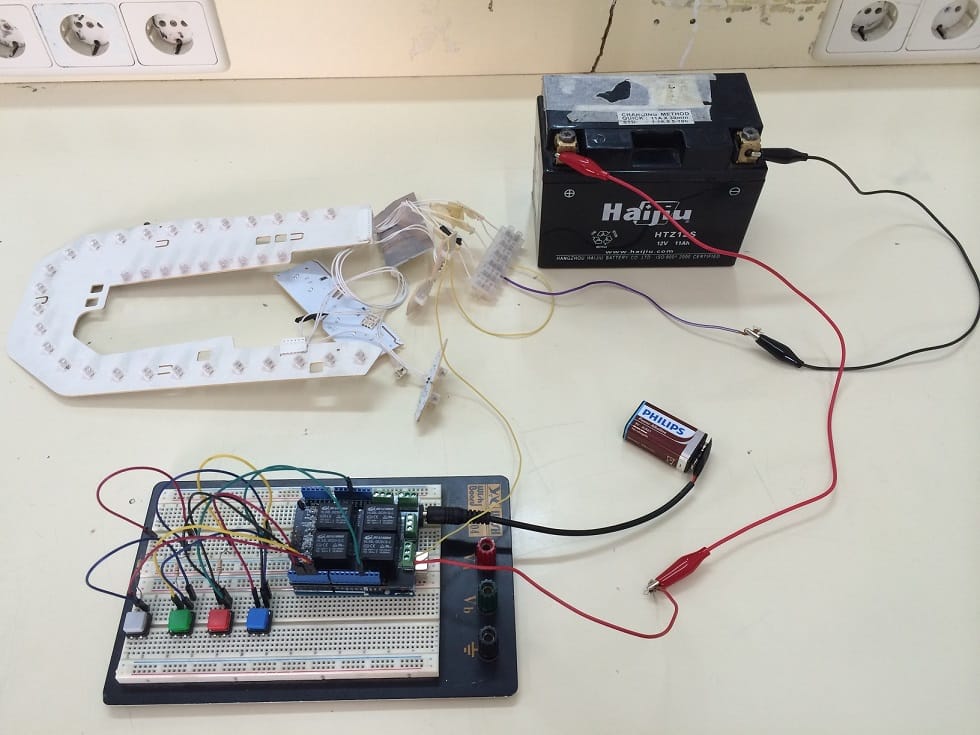* Arduino Uno. * Placa de reles para arduino. * Cuatro pulsadores. * Cautro resistencias de 10K * Cable para conexiones. * Diodos de piloto trasero de vehiculo. * Batería.